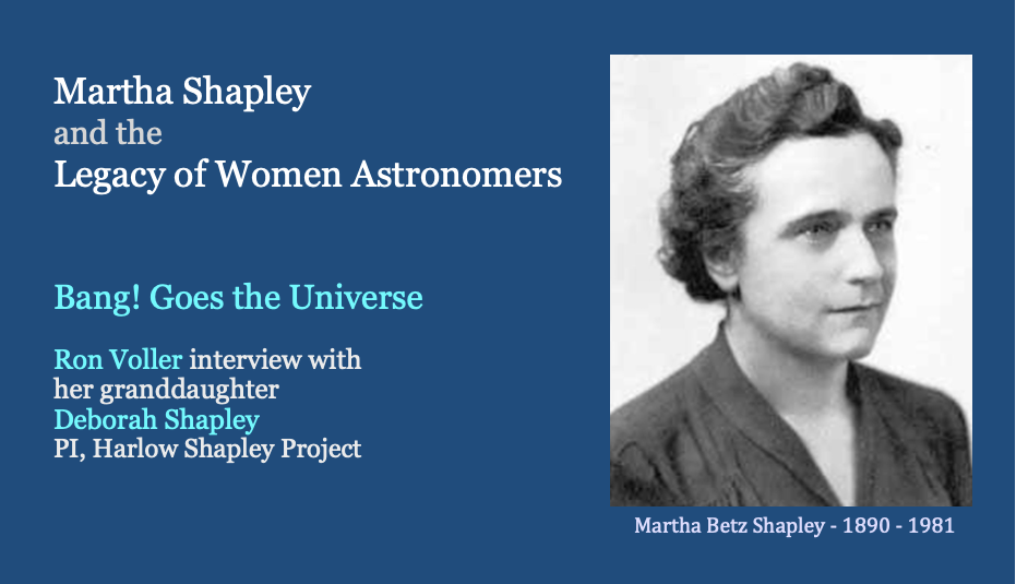 Martha Betz Shapley (1890 - 1981) was the wife of Harlow Shapley (1885 - 1972). Deborah Shapley, a granddaughter of Martha and Harlow, recently spoke with Ron Voller on his podcast Bang! Goes the Universe.