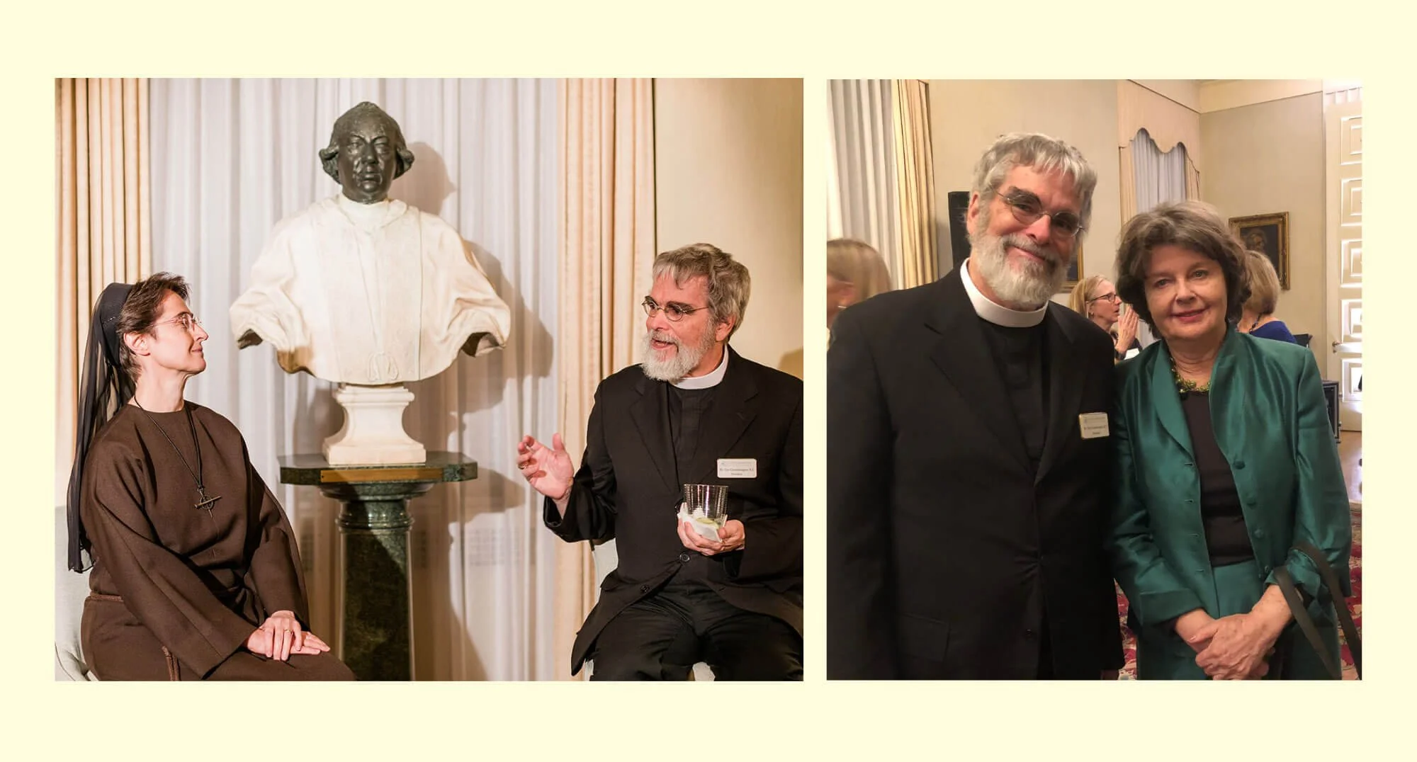 Reception for Vatican Observatory Foundation at the Apostolic Nunciature in 2022, The 75 or so guests and other clerics heard Sister Raffaella Petrini interview Br. Guy. about the Very Advanced Technologiocal Telescope (VATT) which the VOF supports in Arizona, Right is Br. Guy and Deborah Shapley. HarlowShapley.org