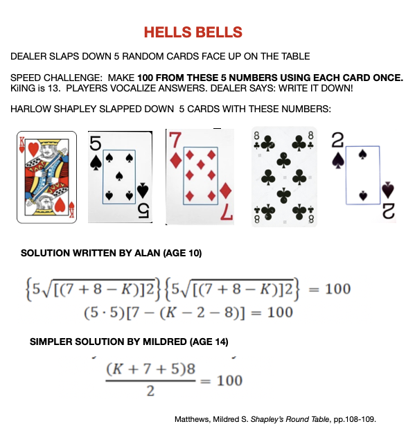 They all competed as to who could produce the simplest solution fastest. Hells Bells became a regular pastime, she writes, because you don’t need a complete deck of cards! v